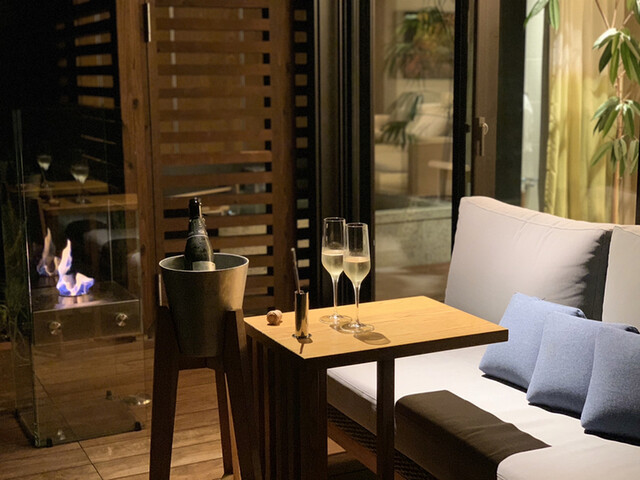 テラスで泡と暖炉