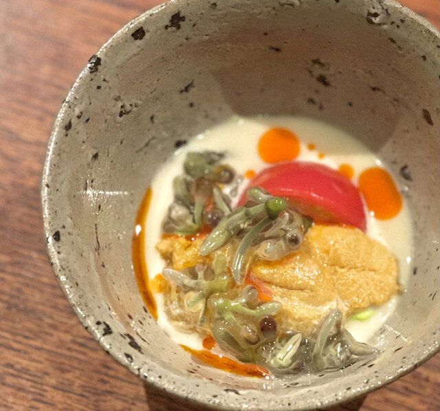 雲丹、枝豆、じゅんさい、冷やし坦々麺胡麻のスープ