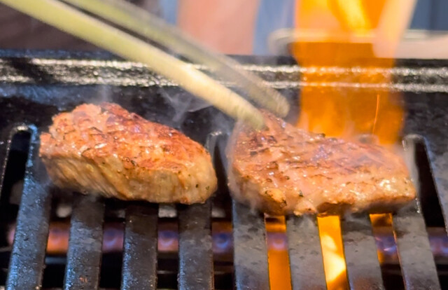 焼肉の焼ける音、脂でたちのぼる炎、