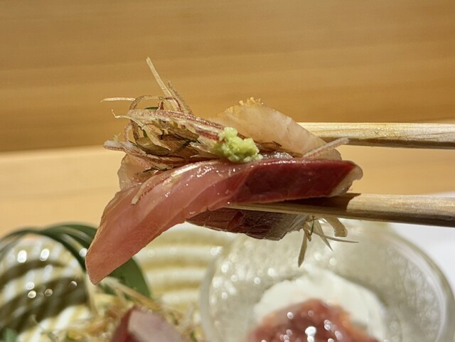 ◾️大船渡のブリ刺身とマスカルポーネとカツオの酒盗 ブリの刺身の下に敷かれた茗荷と大葉の妻をブリで包んで頂いた。脂ののったブリの旨みと美しいツマの饗宴である。珍しいカツオの酒盗の塩味がチーズとの相性抜群でお酒のつまみとしても最高である
