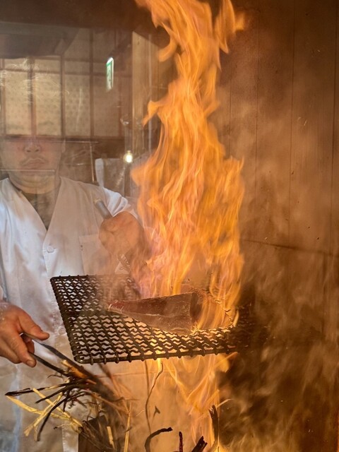 注文してから店内カウンター越しにワラで炙ってくれる。炙り立てはとても香りが良くとても美味しい。店内にも香りが漂って最高だ。カツオは本場高知から仕入れたもの。