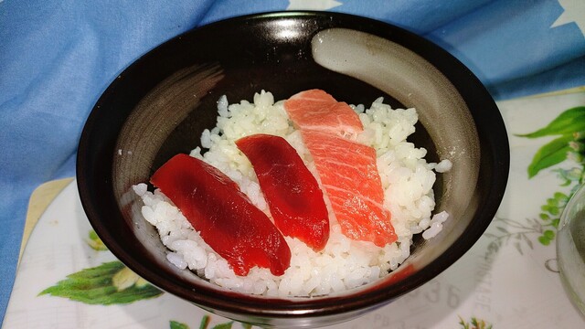 ご飯は酢飯を用意しました、ご飯にねぎを敷き詰めて、まぐろをのせて