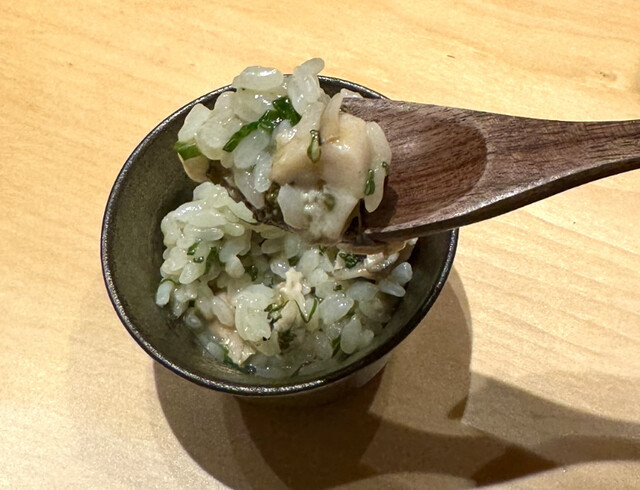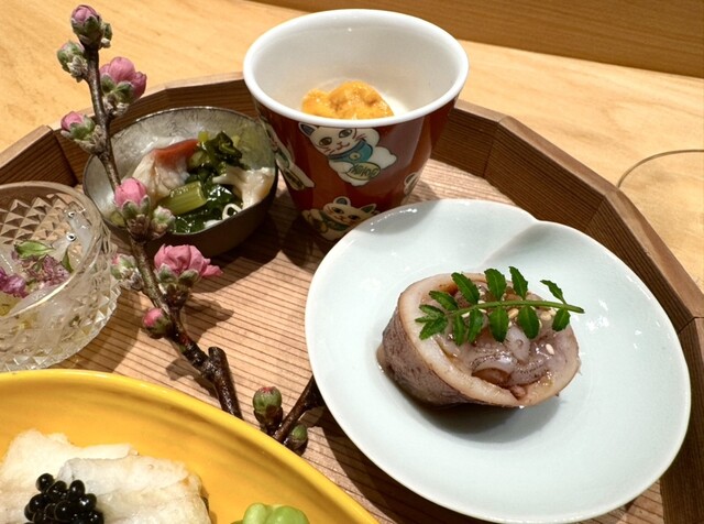 「花わさび ホッキ貝と平貝の煎り酒のお浸し」は、上品なお出汁が貝の旨味を存分に引き出しています。