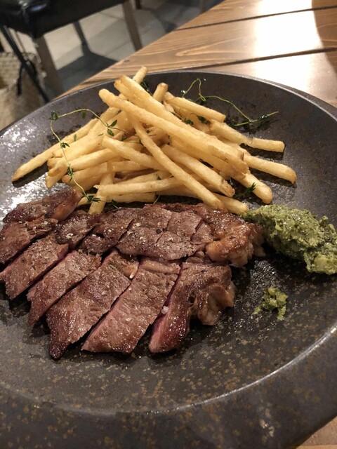 ピザは、塩気の効いたチーズの上にベビーリーフ等の早済が乗ったもの。特にドレッシングはかかっていませんでしたが野菜にではなく、塩気の効いたチーズと相まって、美味しくいただきました。その後、牛ロースのグリルとチキンのローストが運ばれてきました。牛ロースのほうは、玉ねぎのピクルスとケイパ、マスタード、パセリを微塵切りにして和えたものを肉にのせて食べると、口の中が大変爽やかになり、いくらでも肉が食べれます。チキンのローストはニンニクの風味がガッツリと効いて、ビールにあいそうです。
