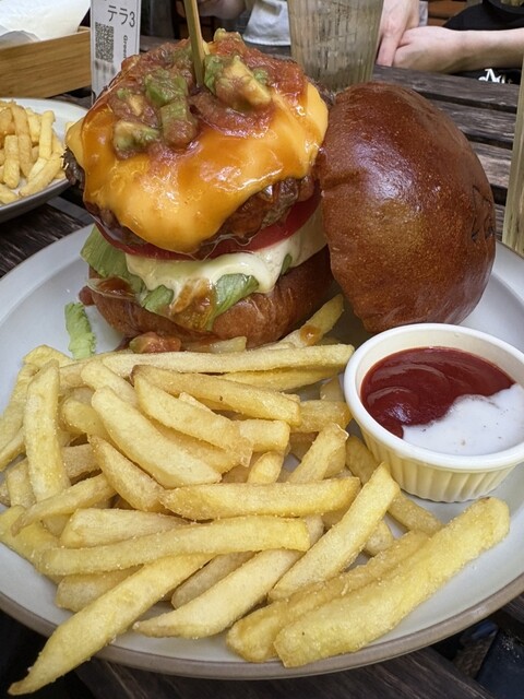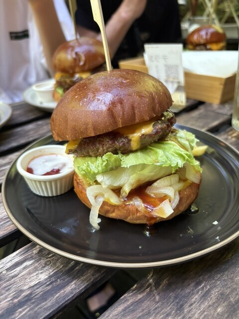 広さはないものの、完全に森の中、小さな川もながれており、水辺にはイモリまで。文句なしです。このロケーションで食べるハンバーガーがマズイはずがない。サイコーにうまかったです。これでもかっていう高さのハンバーガーは、たとえ潰したとしても、一度にかぶりつくことはできません。こんかいはチーズバーガーのサルサソースタイプを注文。パティも厚みがありジューシーで食べ応えあります。
