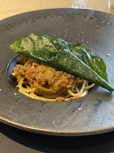京鴨:きぼそうという唐辛子の葉っぱが上に乗っている パスタ料理です。ひと味もふた味も味付けに工夫がなされており食べたことのない深い味わいでした。
