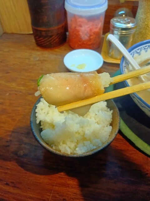 レアぎりぎり炊き上げの大ぶりチャーシュー。最近3枚に当たること多くて嬉しい。アザス。切り身サイズの加減でしょうが笑