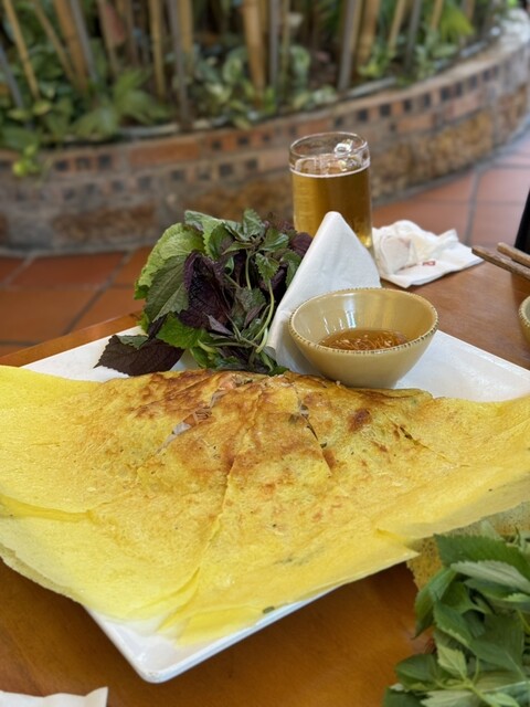 「ベトナム風お好み焼き」「ベトナム風クレープ」とも言われる名物で、 ハーブで巻いて甘酸っぱいヌクマムのタレに付けて食べるのが本場流。 これがもう最高。