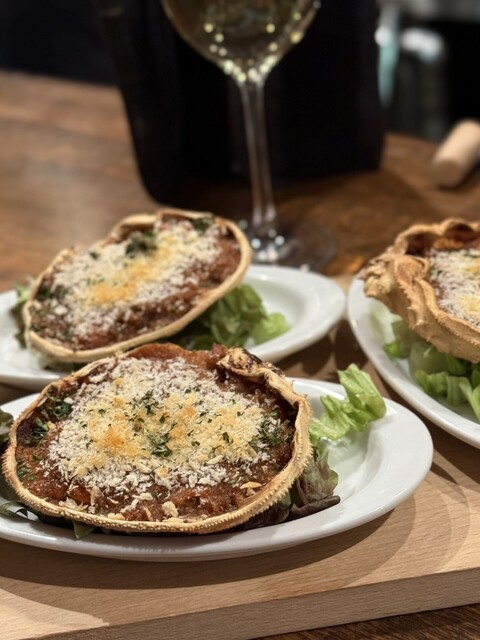 ズワイ蟹のオーブン焼きは、蟹の身を玉ねぎやトマト、蟹味噌と混ぜて甲羅ごと焼き上げた贅沢なバスク料理。 しっかり蟹の旨みがあって、これも白ワイン泥棒