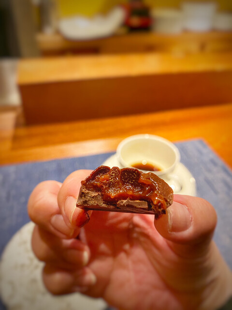 焼き菓子はブラッドオレンジの皮を入れたフィナンシェと、サラダで使われたオスミックトマトを煮詰め糖度40度にしたものを中に入れた美しいジュエリーのようなチョコレート。