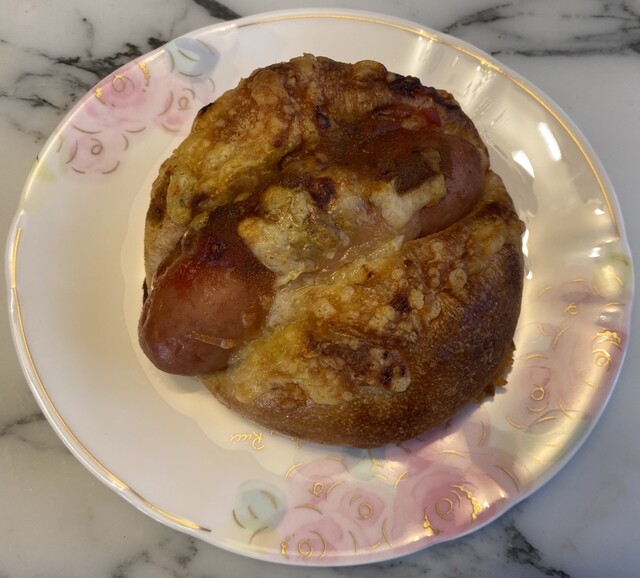 翌朝自宅にて。パリパリチーズとカレー風味でブルスト(フランク)のパン生地も美味いです!