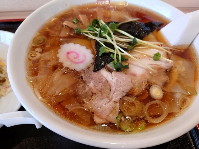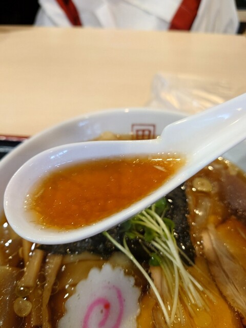 スープを一口 鼻から抜ける出汁の良い香り そして口の中に広がるカエシの甘さ やはりここのラーメンは美味い。チャーシューもホロホロが2枚 海苔 ナルト メンマ かいわれとオーソドックス