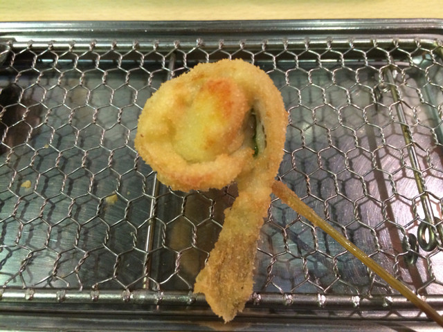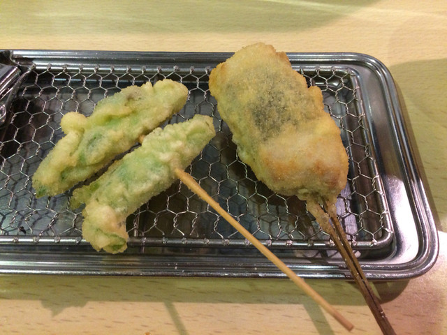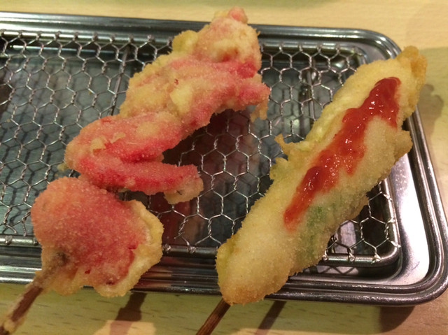 串かつも定番の海老ぎんなんやキスの数の子巻きなどに加え旬の食材を混ぜながら揚げてくれます。シンプルな串かつもいいけど創作串かつは組み合わせた食材のハーモニーがいい‼︎