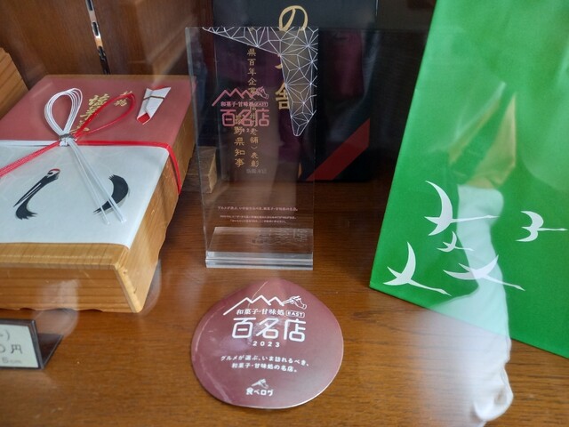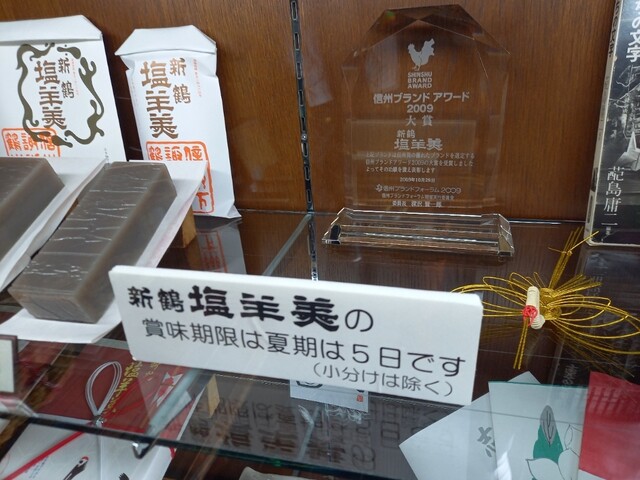 長野県諏訪郡。2023年百名店。1873年から続く和菓子店。「もちまんじゅう」「塩羊羮」のほか生菓子の数々が店頭に並び、塩羊羮は宅配便も可能。
