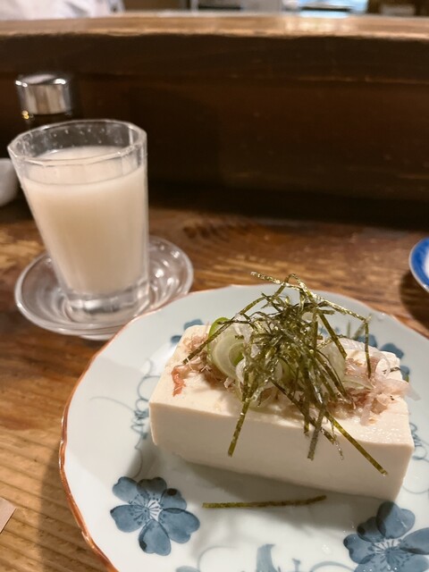 コの字カウンターの向こう側から割烹着姿の店員さんに日本酒を注いでもらう