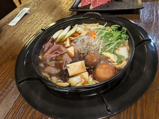 関東風すき焼きで、割下に野菜から順に入れて煮るスタイルで、自分で具材を入れて食べます。