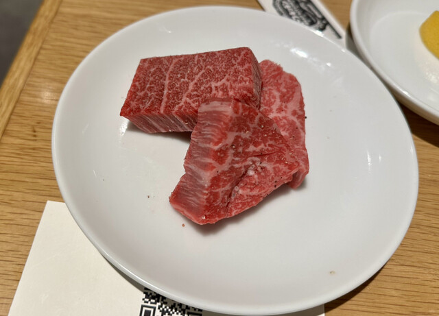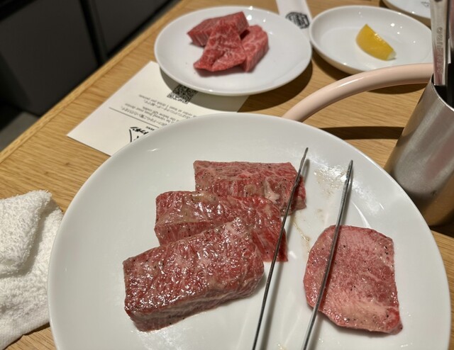 メインの焼肉は厳選タンから始まり、特選ハラミ、和牛シャトーブリアン。タンはレモンで、その他は味付けされてるので、何も付けずにと店員さんから。