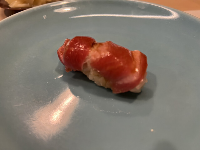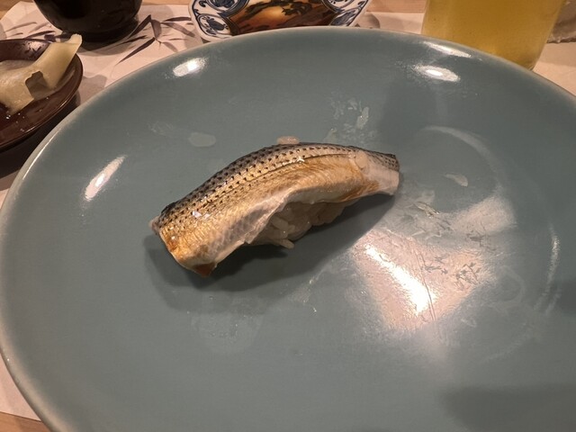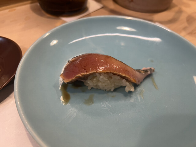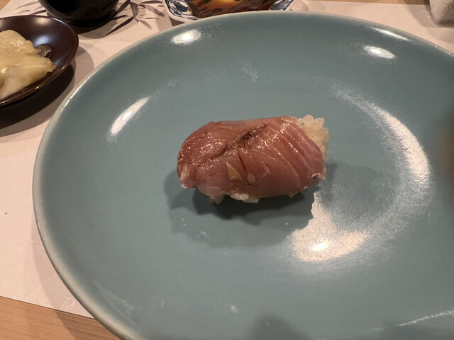 最初の三貫。こちらも私のリクエスト。図々しくリクエストなんておこがましいのですが、満腹状態でのにぎりではなく空腹ならではの鮨屋のにぎりをいただきたく何回か前から最初の三貫をお願いしています。本日の最初の三貫は大間の本鮪の大トロ、淡路の鯵、北海道の牡丹海老でした。私はもちろん主人や隣客の方々も美味しそうにいただいていました。