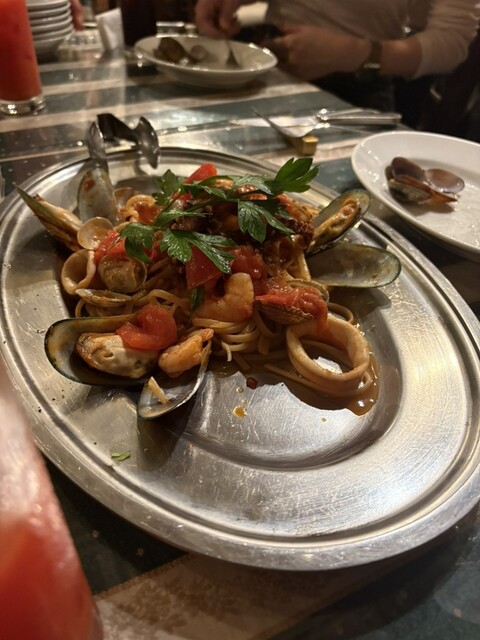 今回初めていただきました、パスタは、アラビアータ、ボンゴレを注文。人数によってパスタのグラム数と目安人数の記載があるので助かります。パスタは初めてですが、多分タリアテッレの幅間の麺で具沢山で美味しかった!