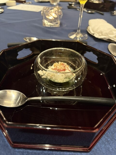 食前のお愉しみは、カブにマスカルポーネがまぶしてありうまく混ざり合っていてとても美味しかったです。次の魚介類のタンバル、ブロッコリーのムースは、こちらも初めてたべたお味でほのかにブロッコリーも感じ優しい味わいでした。食感が野菜のシャキシャキと魚介類のプリっとムースのなめらかな感じが混ざりあい食べていて楽しかったです。シェフの工程を考えたらなんとも大変なお料理、とても美味しかったです。あとは、マッシュルームのポタージュ。濃厚すぎるマッシュルームスープ、泡立ちを加えずっと飲んでいたくなるスープてました。美味しすぎて家でもマッシュルームスープ作りました。あとあと、感動したのは「かずさ和牛のロースト」今まで食べたコース料理の中でお肉がとんでもなく柔らかくて美味しかった。