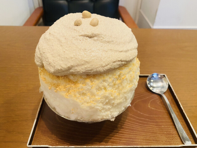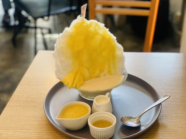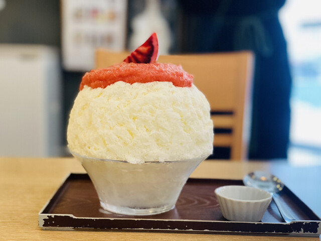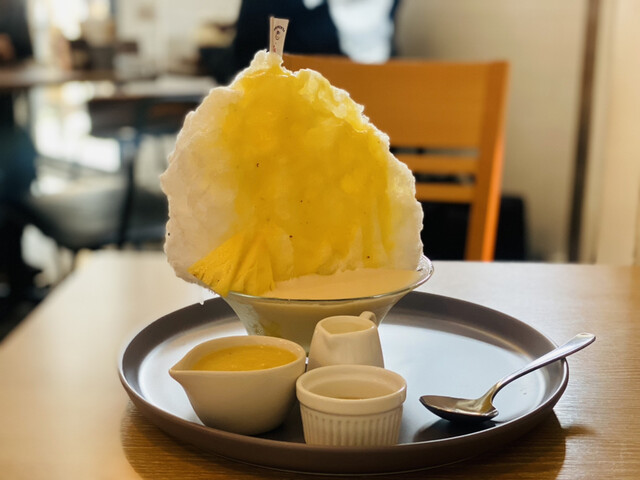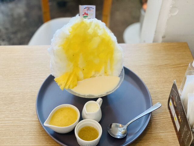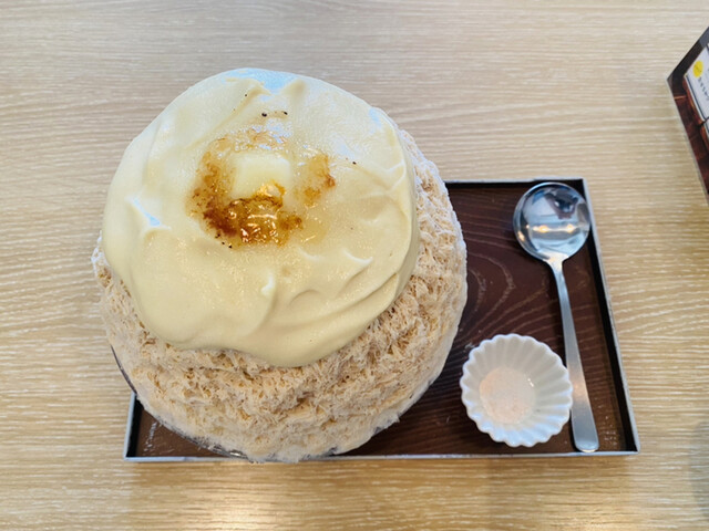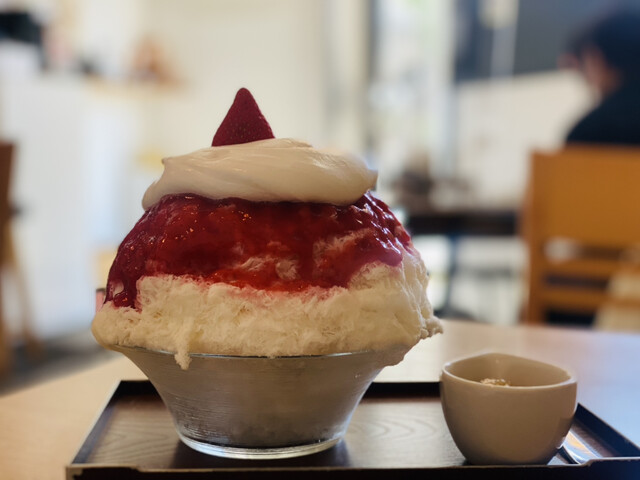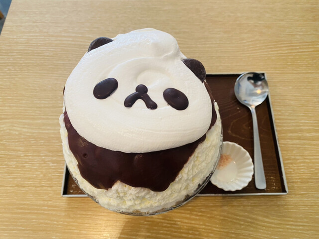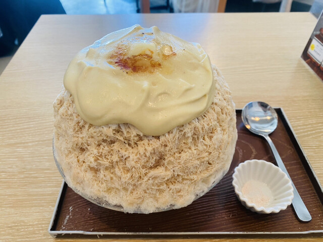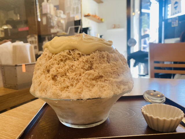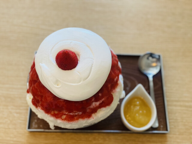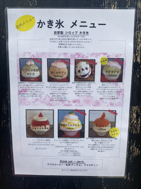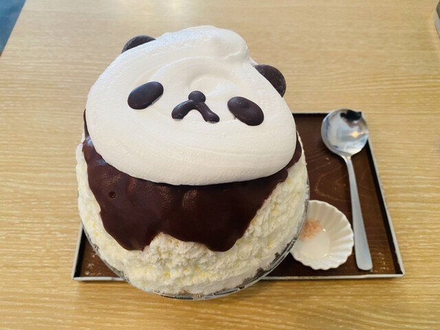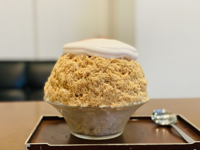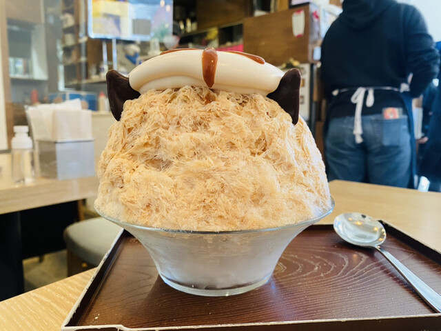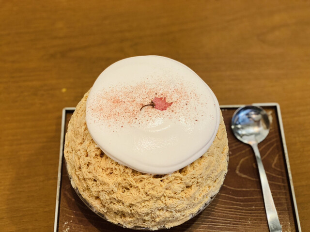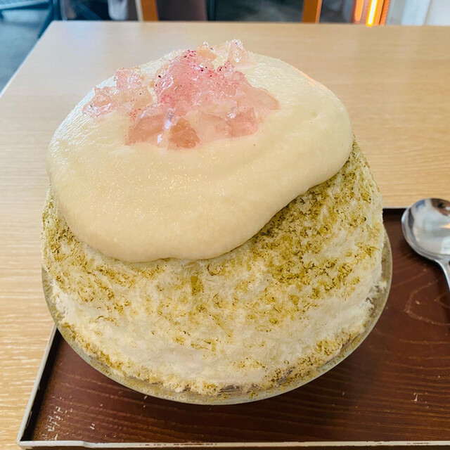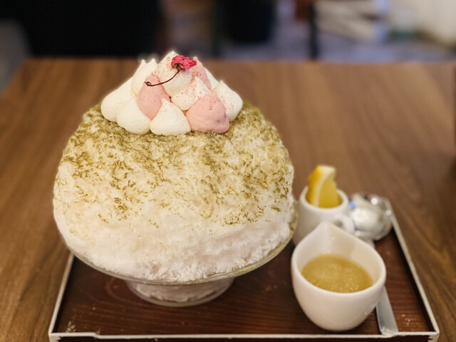 とっても可愛らしいトップに桜と桜クリームエスプーマがたっぷりのかき氷。ベースはアッサムミルクティーでほんのり甘くて美味しいー。