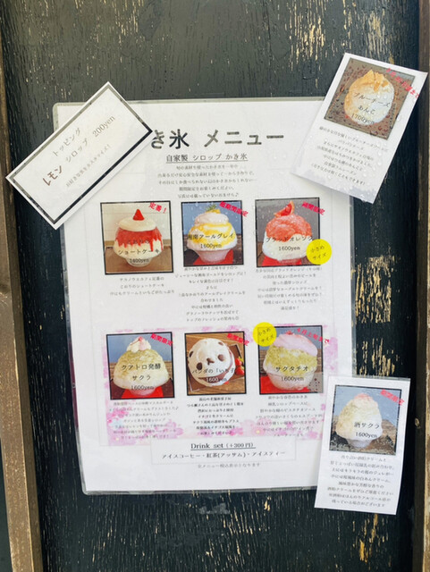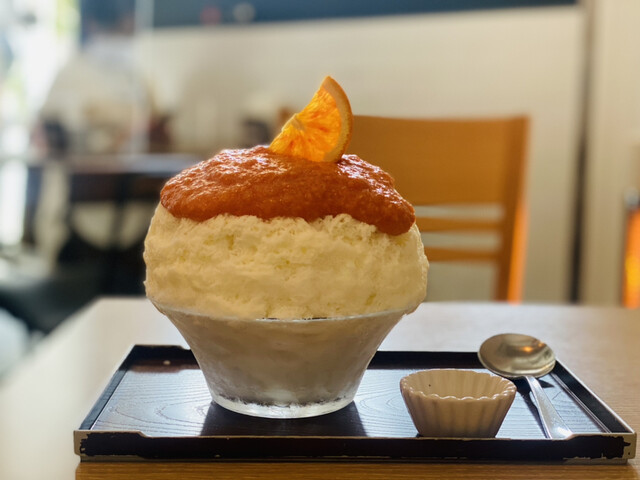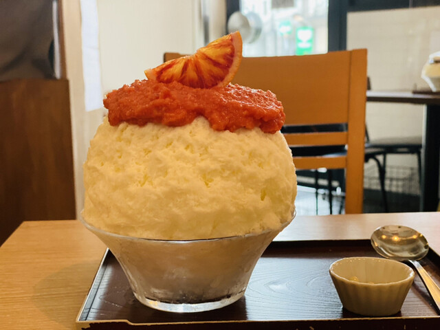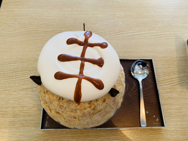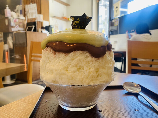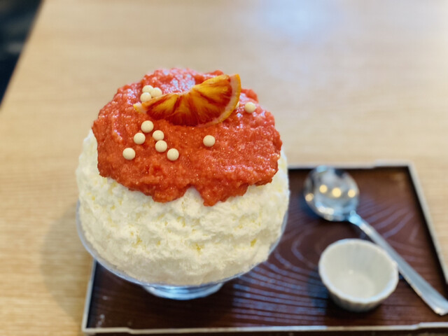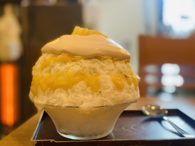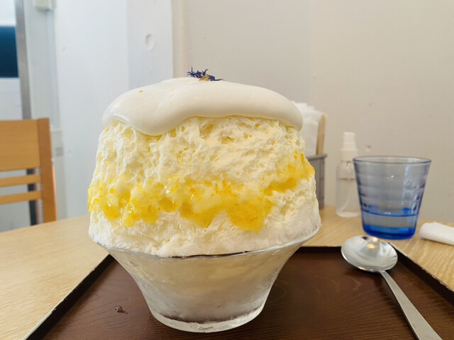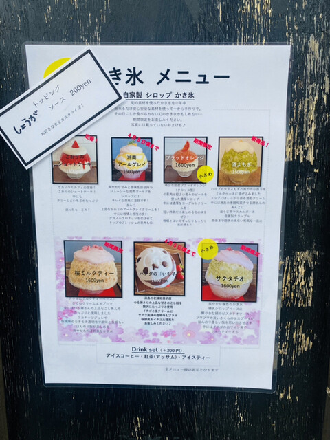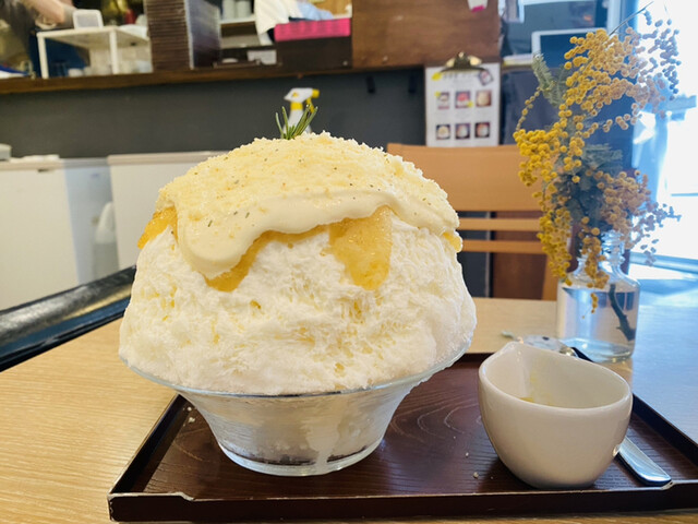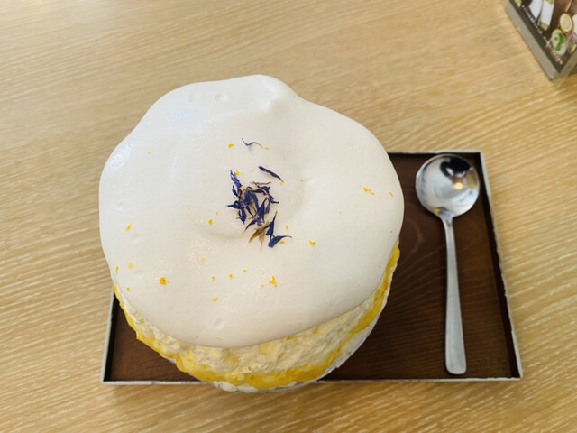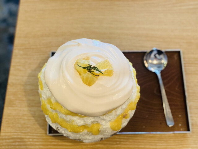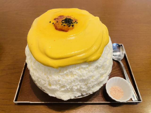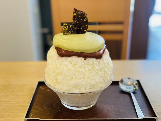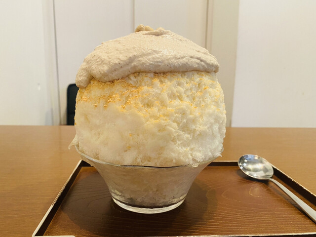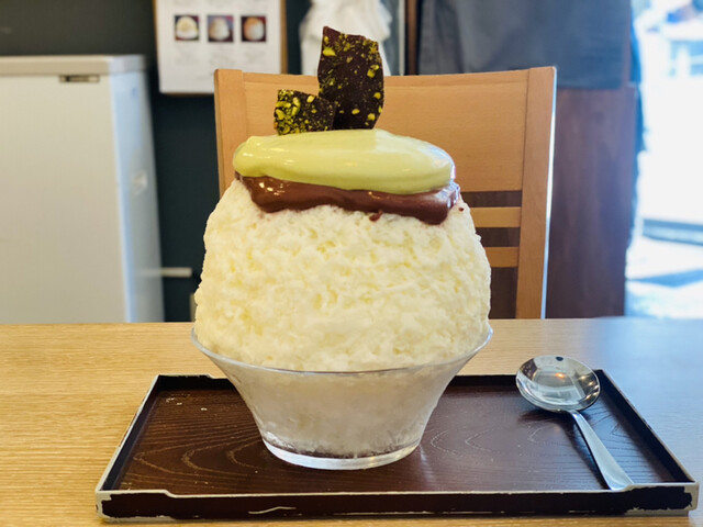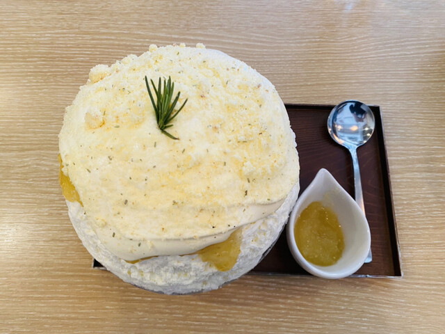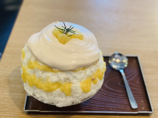 とっても可愛らしいトップに桜と桜クリームエスプーマがたっぷりのかき氷。ベースはアッサムミルクティーでほんのり甘くて美味しいー。