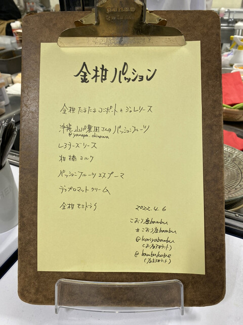 トップには、金柑セミドライ、金柑たまたまコンポート、パッションフルーツ。パッションフルーツのエスプーマがめっちゃ美味しいー。柑橘ミルク、金柑たまたまのジュレ、レアチーズソースがさらにめっちゃ合う。