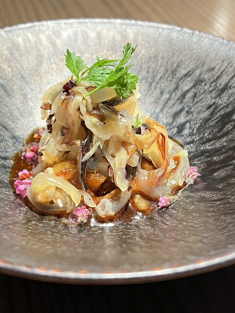 胡麻豆腐のなめらかさとクラゲの食感が楽しく、ピリッと辛いソースが全体を引き締めます。
