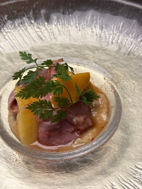 ・完熟アップルマンゴーと鴨のサラダ 焼きナスとバターのピュレ