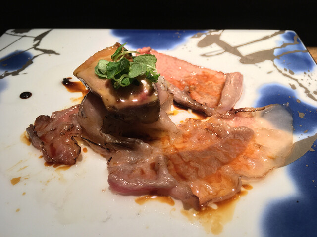 大きなお皿の上に豊後牛の一枚肉、フォアグラ乗ってます、寿司飯見えません