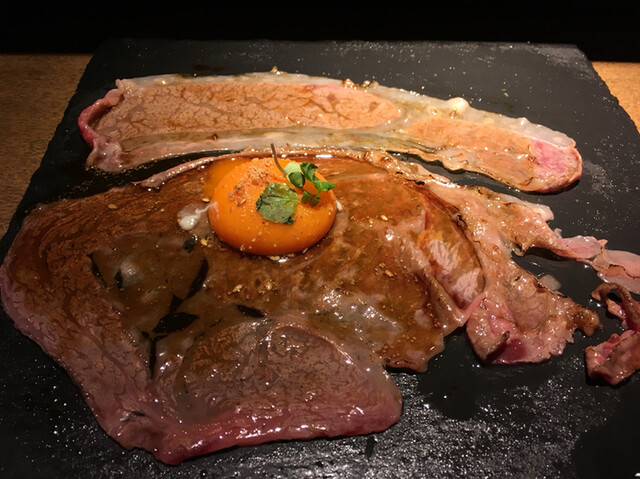 「こちら 卵を中央に乗せて お肉で巻いてから ひと口でお召し上がり下さい」との事