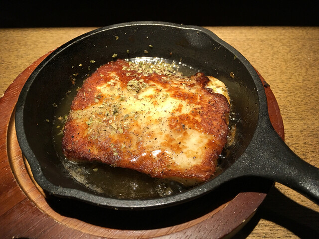 小さいフライパンの上に焼いても溶けずに形のしっかりとしたチーズ 上にはオレガノかな?が掛かってます