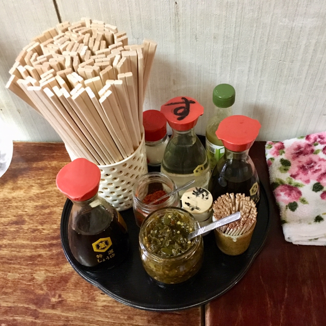 因みに調味料は、醤油の他は 青唐辛子・一味・七味・お酢・塩・柚子胡椒が まとめて置いてあります