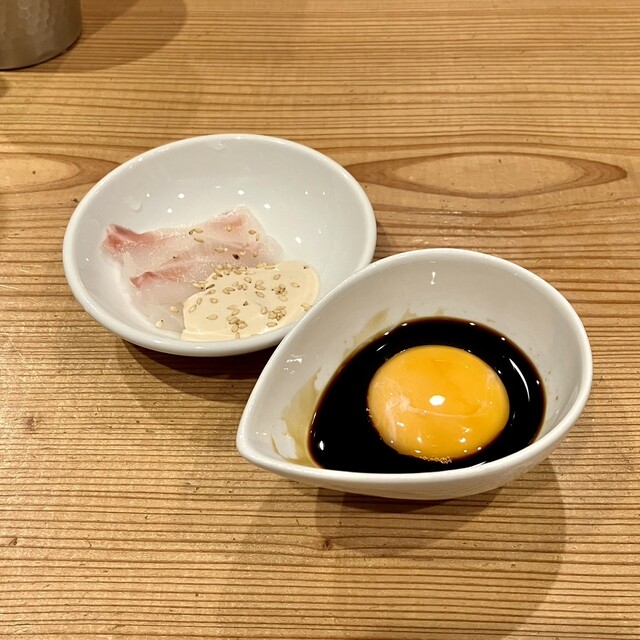 注文が済むと最初に漁師めし用の卵黄醤油と鯛茶漬け用の鯛の切り身が配膳され説明を受けます