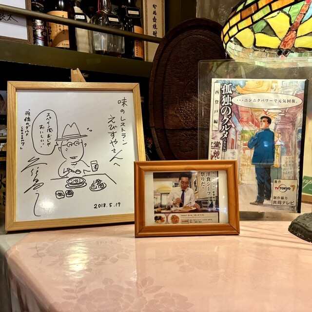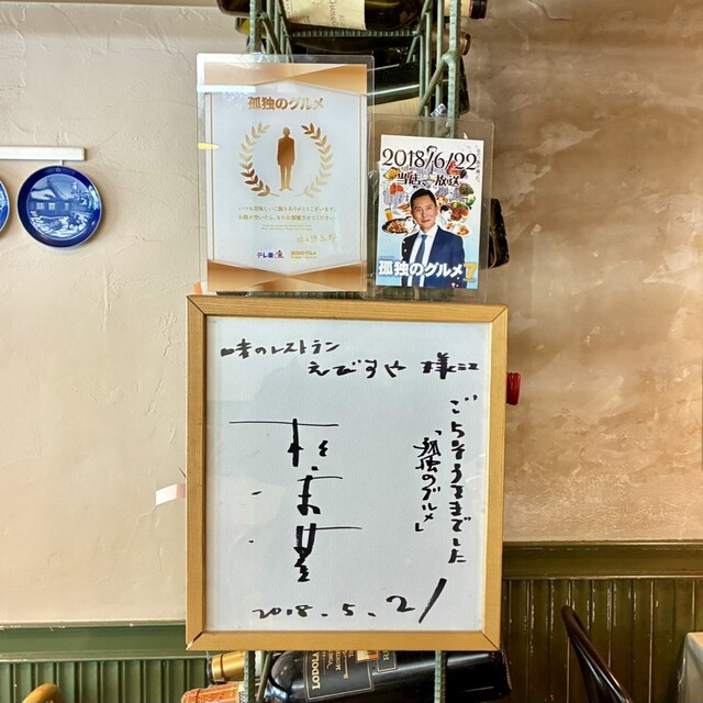 食後お会計の時に どうしても気になったんで【孤独のグルメ】のサインは何処に飾ってあるのか聞いてみると「松重 豊」さんのサインは 丁度自分の真後ろに、原作者の【久住 昌之】さんのサインは お店奥のテーブルの上に飾って有りました