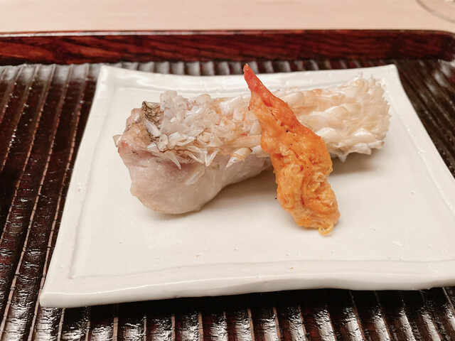 甘鯛の炭火焼き、鱗の松笠焼きとバチコ