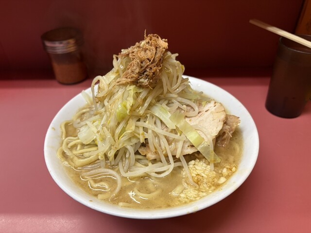 助手さんがトッピングしてたので、やや低めのヤサイタワーに初見の豚ほぐし?が鎮座。