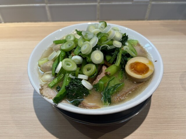 特製塩中華そばに青菜(並)を追加。あえて大盛にせず、限定のニボチー和え玉も追加で。