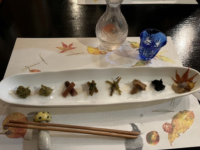 手作り山葵漬け•赤かぶ•ヤマメの卵•鮎の白子•オイカワの煮付け•イナゴの佃煮