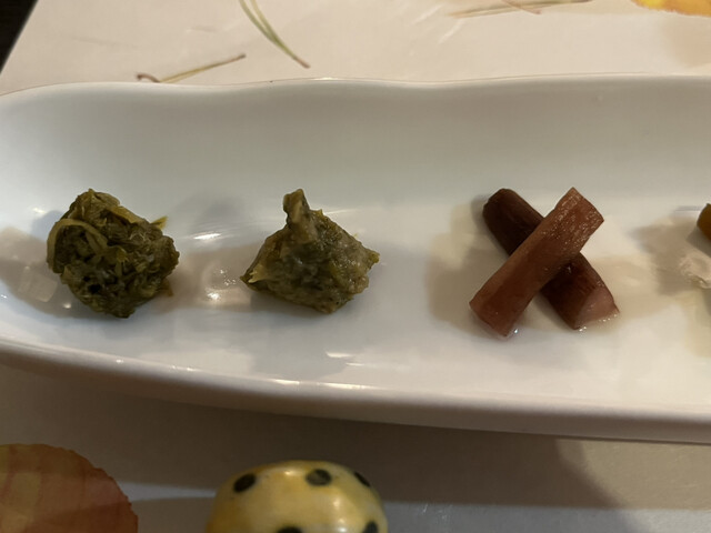 蕗のとうの煮物、蕗のとう味噌、芋がら、わさびの茎、香茸他