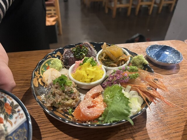 (サーモン、えんがわ、シメサバ、鰤の胡麻和え、タコのわさびポン酢あえ、松前漬け)