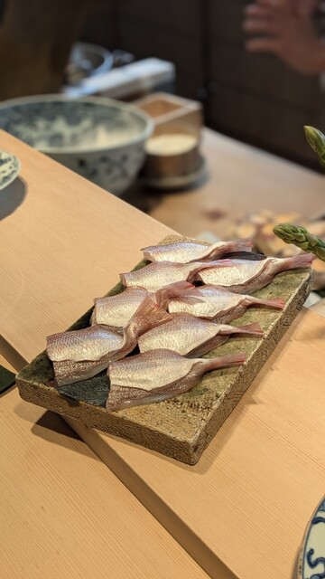 エビ・ヒラアジ、花鯛、アスパラ、アオリイカ、ゴボウ、マイカ、甘鯛、たけのこ、鯵、アカムツ、玉ねぎもとても美味しく、大満足な天ぷらコースでした。