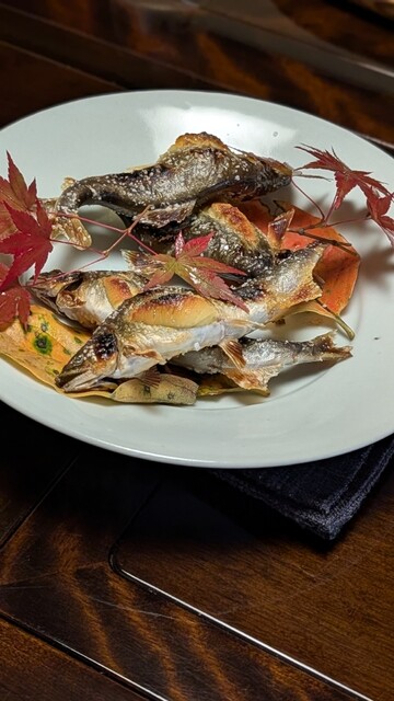 【子持ち鮎と松茸ご飯、川海苔、鯉こく】