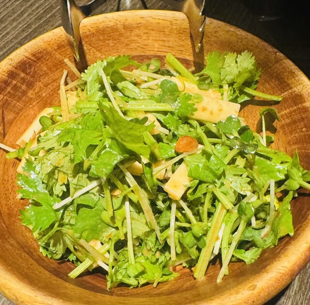 久しぶりに黒猫夜さんへ。六本木交差点(麻布警察側)にほど近い雑居ビル4階。照明を落とした店内には、アジアンテイストの木製アンティーク家具や中国風のランプシェードがアクセントとなって異国情緒を感じます。なんだか“旅先の夜市”を思い出す雰囲気。8名だったので個室を利用し、屋根裏部屋のようなお部屋で大きな円卓を囲みました。