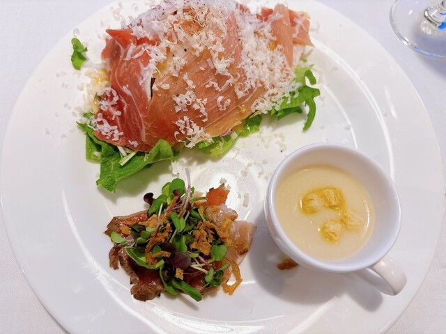 ①パルマ産熟成生ハムサラダと鰹のカルパッチョ、本日のスープ