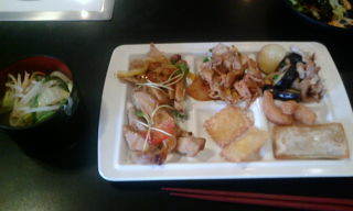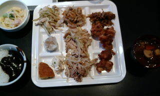 皿の真ん中の列に縦に並んでいるのが、「若鶏とねぎのガリバタ」、「豚豆腐野菜いため」、「むし鶏のネギしょうがダレ」なのですが、皿に盛り付けると、ぱっと見はそっくりです。野菜といっても、ほぼモヤシなので。