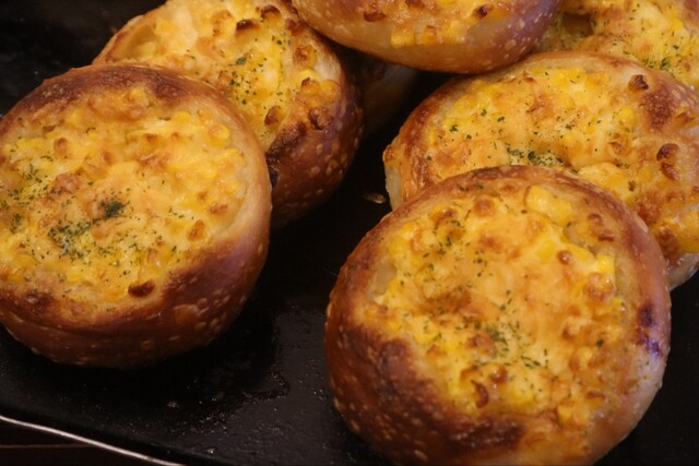 チーズを乗せたパン。コーンがプチプチで甘い。
