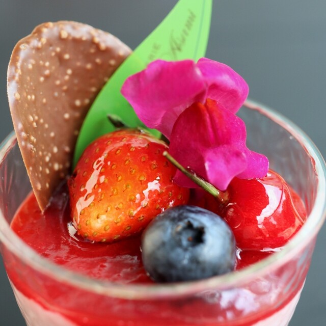 シャンパンにミックスベリーのムース・バニラムースとダークチェリーのクーリー。