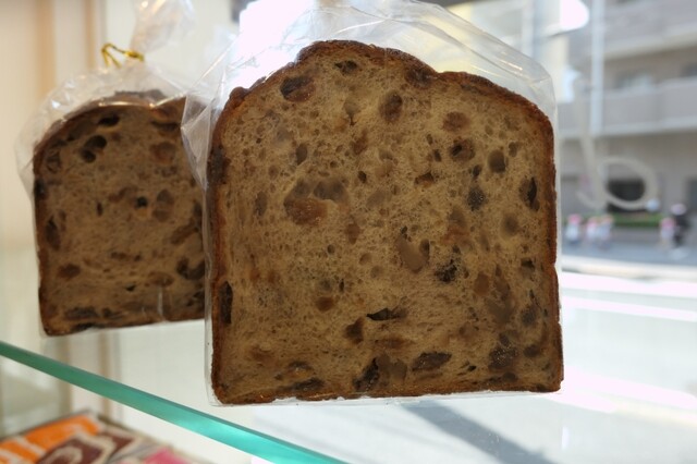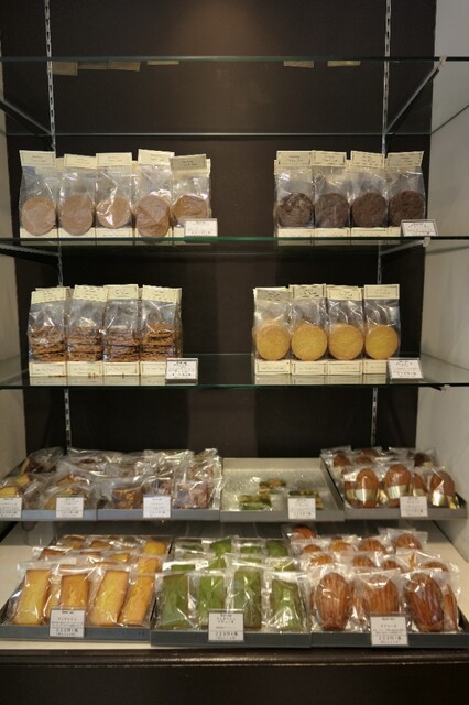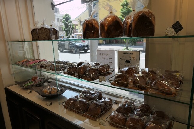 店内は右手窓際にパンの棚があり。中央と右奥に焼菓子棚。