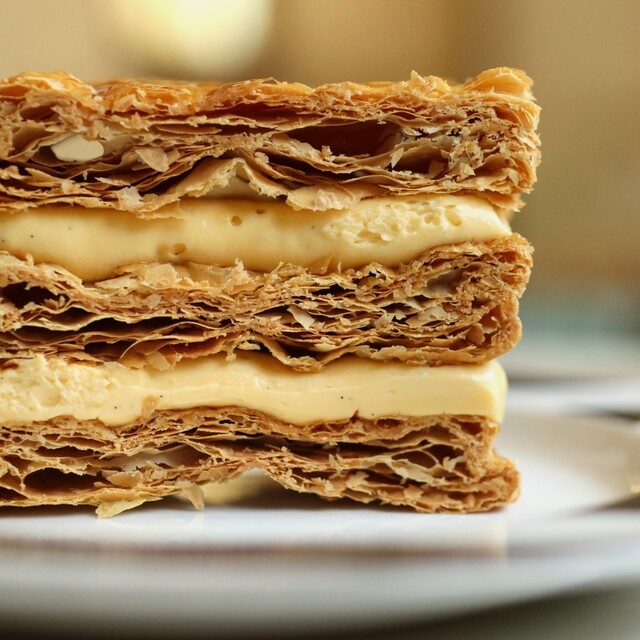 香ばしく焼き上げたパイ生地に、バニラビーンズを使用したクリームをサンド。